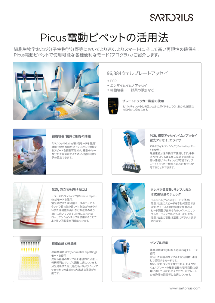 当資料では、Picus電動ピペットで使用可能な各種便利なモード(プログラム)をご紹介しております。 『Picus電動ピペット』は、96、384ウェルプレートアッセイに対応。PCR、エンザイムイムノアッセイ、細胞培養などにご活用いただけます。 ...