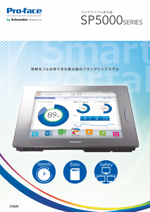 Pro-faceのフラッグシップ表示器 SP5000シリーズの詳細情報をまとめたカタログです。 仕様、システム構成図、オプション一覧など、SP5000シリーズの詳細を確認できます。 ワイヤレスLAN内蔵モデルも掲載しています。 【サイズ】 19...