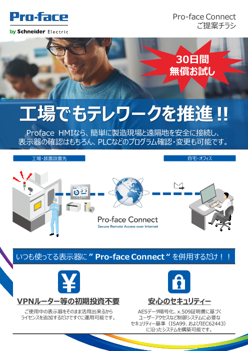 「テレワーク」 Pro-face Connectはわずかな工数・コストで遠隔監視の実現をサポートするソフトウェアです。遠隔地にあるタッチパネルの確認はもちろん、PLCなどのプログラム確認・変更も可能です。製造現場でのテレワーク到来でリ必要なリモートアク...