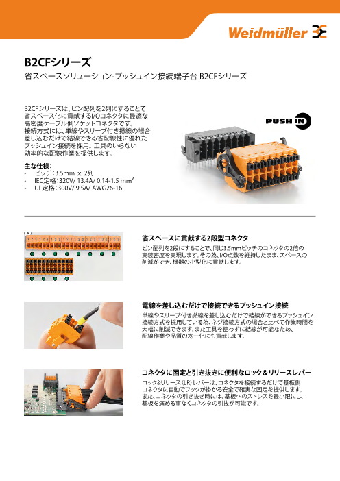 B2CFシリーズ特徴 ■省スペースに貢献する2段型コネクタ ■電線を差し込むだけで接続できるプッシュイン接続 ■コネクタの固定と引き抜きに便利なロック&リリースレバー