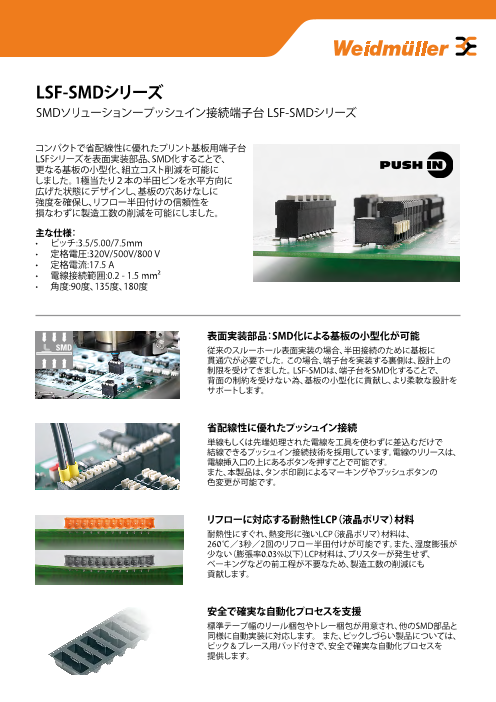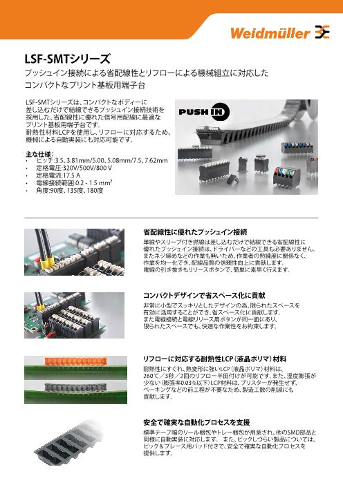 特徴 ■表面実装部品:SMD化による基板の小型化が可能 ■差し込むだけで結線できるプッシュイン接続 ■耐熱性にすぐれ、熱変形に強いLCP(液晶ポリマ)材料 ■リール梱包やトレー梱包を用意 仕様 • ピッチ:3.5mm/5.00mm/7.5...