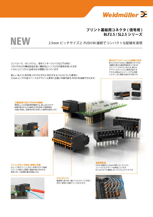 特徴 ■2.5mmピッチの限りなくコンパクトなデザイン ■電線を差し込むだけで結線可能なPUSH IN接続方式を採用