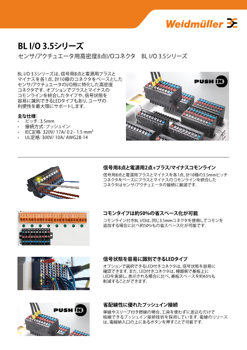 BL I/O 3.5シリーズは、信号用8点と電源用プラスとマイナスを各1点、計10極のコネクタをベースとしたセンサ/アクチュエータのI/O用に特化した高密度コネクタです。 オプションでプラスとマイナスのコモンラインを統合したタイプや、信号状態を容易に識...