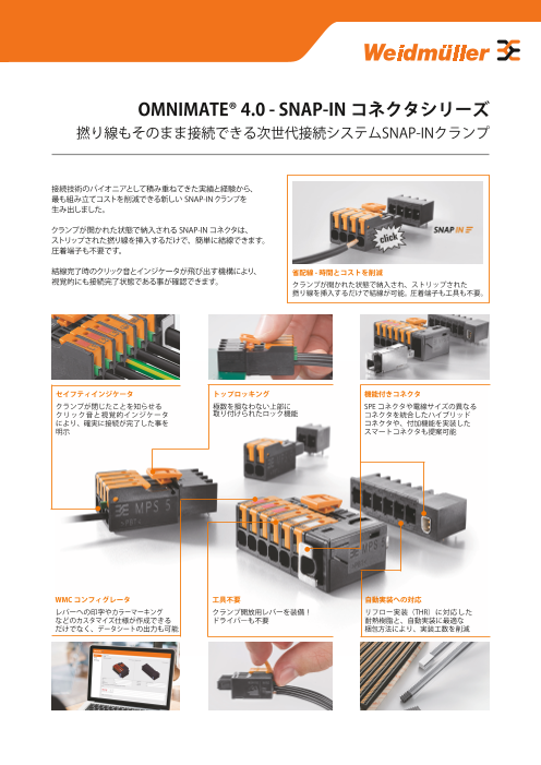 接続技術のパイオニアとして積み重ねてきた実績と経験から、最も組み立てコストを削減できる新しいSNAPIN クランプを生み出しました。 クランプが開かれた状態で納入されるSNAP-IN コネクタは、ストリップされた撚り線を挿入するだけで、簡単に結線できま...