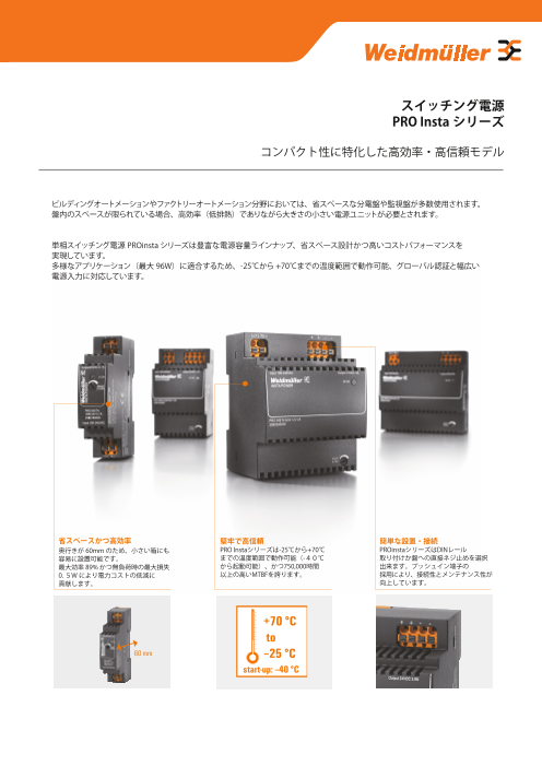 ビルディングオートメーションやファクトリーオートメーション分野においては、省スペースな分電盤や監視盤が多数使用されます。 盤内のスペースが限られている場合、高効率(低排熱)でありながら大きさの小さい電源ユニットが必要とされます。 単相スイッチング...