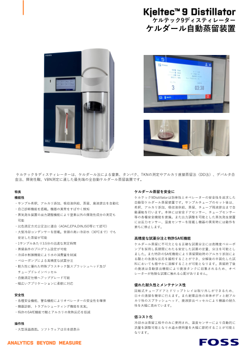 当製品はケルダール窒素分析における確かな精度と再現性、 処理能力、操作性を備えた最新型のケルダール分析装置です。 充実した安全装置、センサー類を搭載し、優れた分析精度と オペレーターの安全性を高い領域で両立しています。 手動蒸留システムか...