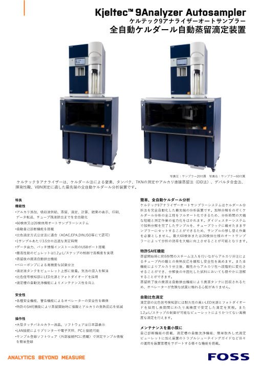 食品関係のたんぱく質分析、繊維分析、脂質分析等... 各製品の分析・測定内容を詳細にご確認いただけます。 【掲載内容】 ・ケルテック 2000及び 8000シリーズ 2100,2200,2300,2400,8100,8200,8400 ...