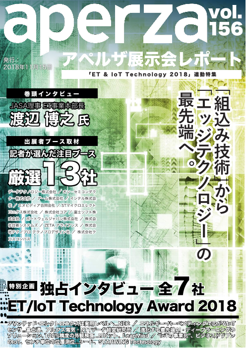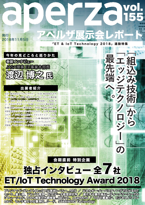 [1] 巻頭インタビュー|JASA理事 ET事業本部長 渡辺博之氏 [2] 出展者ブース取材|記者が選んだ厳選13社! [3] 特別企画|ET/IoT Technology Award 2018 独占インタビュー 全7社 Embedded Te...