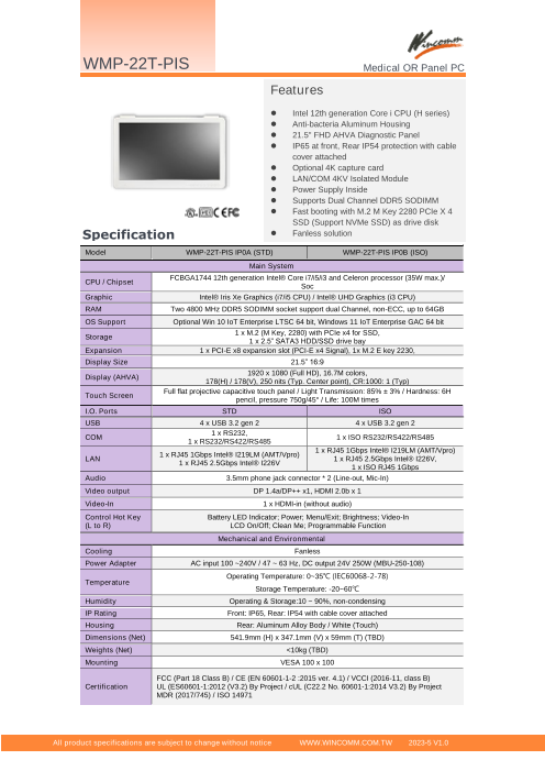 医療規格の60601-1-2EMC第4版を取得した医療用抗菌アルミニウム筐体の21.5型フルHD液晶一体型のファンレス・パネルPCです。医療機器へも応用可能です。オプションのI/Oカバー装着で全面IP54防塵・防滴対応可能です。第12世代Core-i5 ...