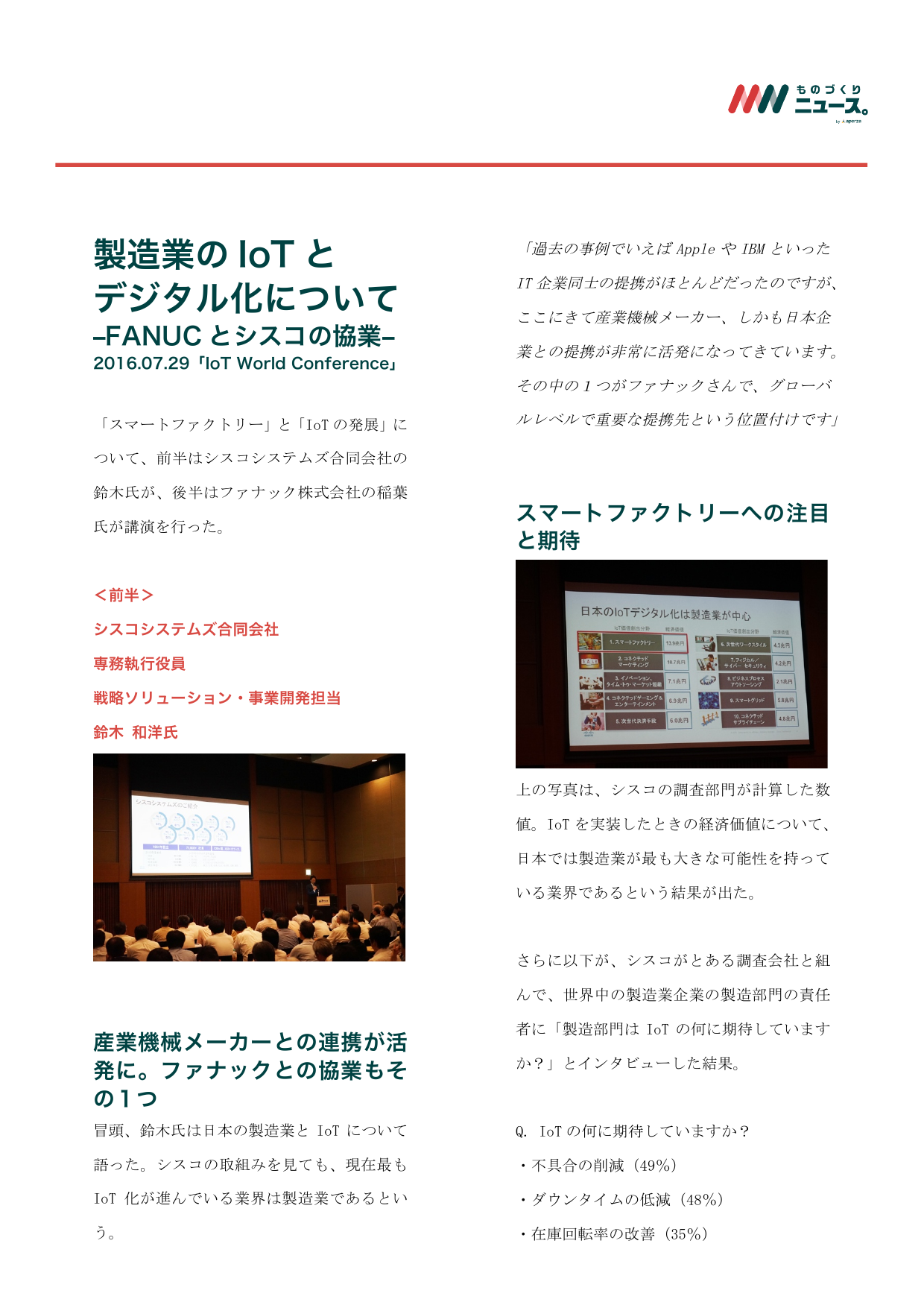 2016年7月29日(金)に「IoT World Conference」にて、シスコシスムズ(同)とファナック(株)がセッションを行いました。そのセッションの内容をまとめたレポートをプレゼントします。 <レポート内容> ・スマートファクトリーへの...