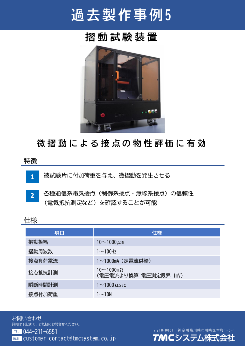 こんな課題をお持ちの方へ ●制御系接点・無線系接点の信頼性を確認したい ●電気抵抗測定を確認したい 装置の特徴 ●被試験片に負荷荷重を与えて、微摺動を発生させる ●各種通信系電気接点の信頼性を確認することが可能 装置の仕様 振動振幅...