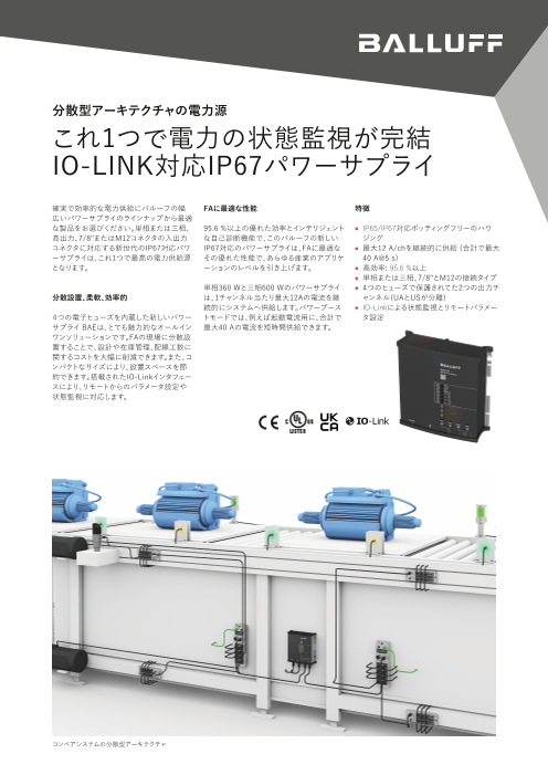 確実で効率的な電力供給にバルーフの幅広いパワーサプライのラインナップから最適な製品をお選びください。単相または三相、高出力、7/8"またはM12コネクタの入出力コネクタに対応する新世代のIP67対応パワーサプライは、これ1つで最高の電力供給源となります。