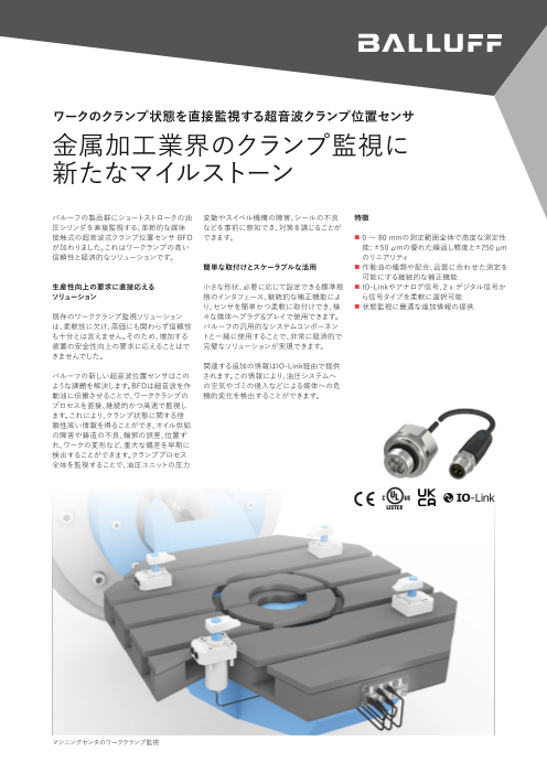 BFDは超音波を作動油に伝搬させることで、ワーククランプのプロセスを直接、継続的かつ高速で監視します。これにより、クランプ状態に関する信頼性高い情報を得ることができ、オイル供給の障害や鋳造の不良、輪郭の誤差、位置ずれ、ワークの変形など、重大な偏差を早期に...