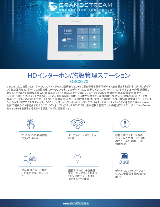 このデバイスは、容易なドアコントロール、インターホンと一斉放送通信、セキュリティカメラ管理など幅広い施設ユニファイドコミュニケーションソリューションとして壁掛けや卓上設置が可能です。 GSC3570は、7インチタッチパネルLCDと全二重双方向のHDオー...
