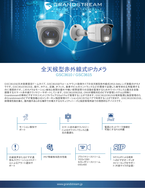 GSC3610は天井設置固定ドームタイプ、GSC3615はウォールマウント砲弾タイプの全天候型赤外線式(IR)3.6㎜レンズ搭載のIPカメラです。GSC3610/3615は、銀行、ホテル、店舗、オフィス、倉庫やビルのエントランスなどの環境で近接した被写体...