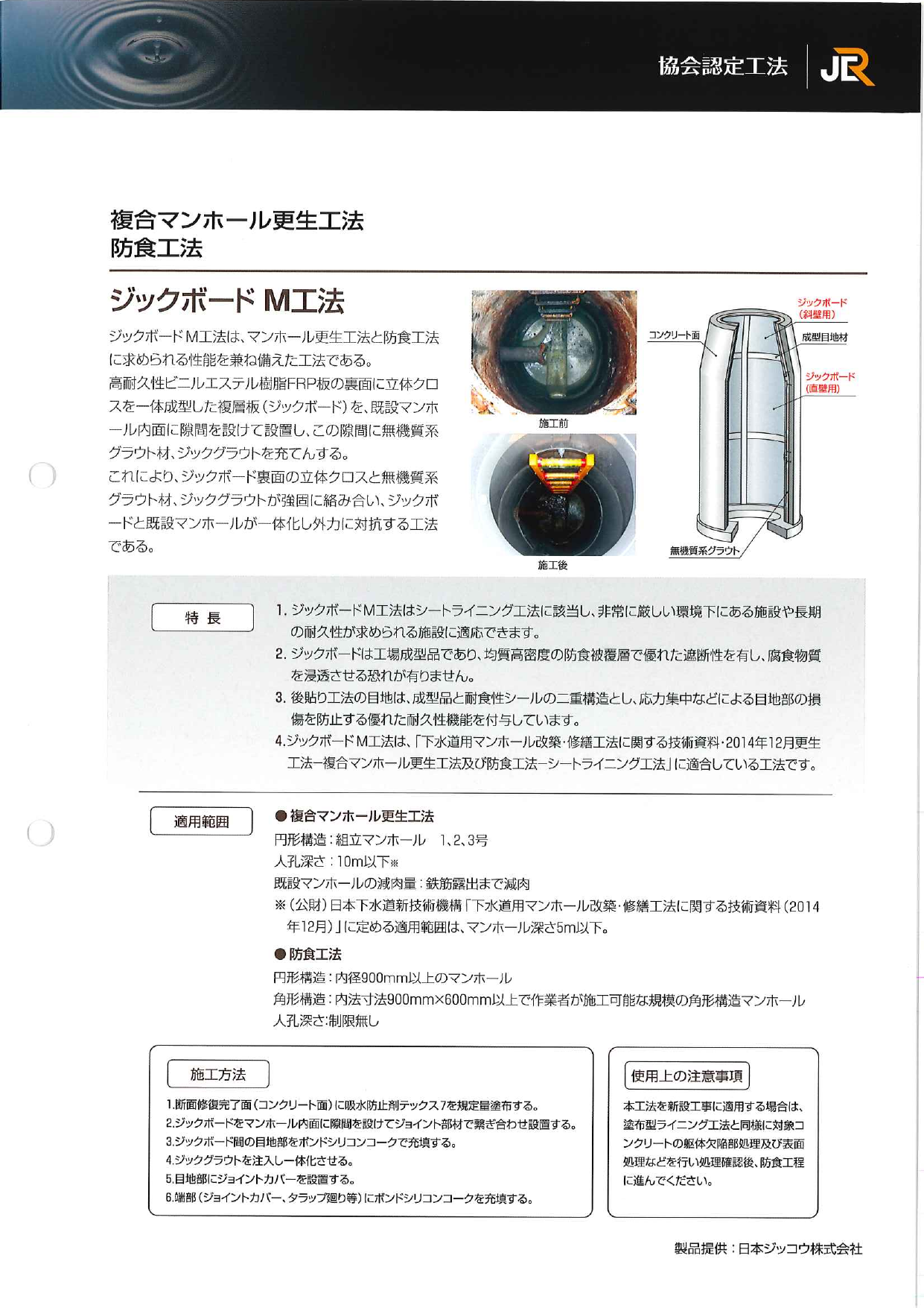 ジックボードM工法は、マンホール更生工法と防食工法 に求められる性能を兼ね備えた工法である。 高耐久性ビニルエステル樹脂FRP板の裏面に立体クロスを一体成型した 複層板(ジックボード)を、既設マンホール内面に隙間を設けて設置し、 この隙間に無機質...