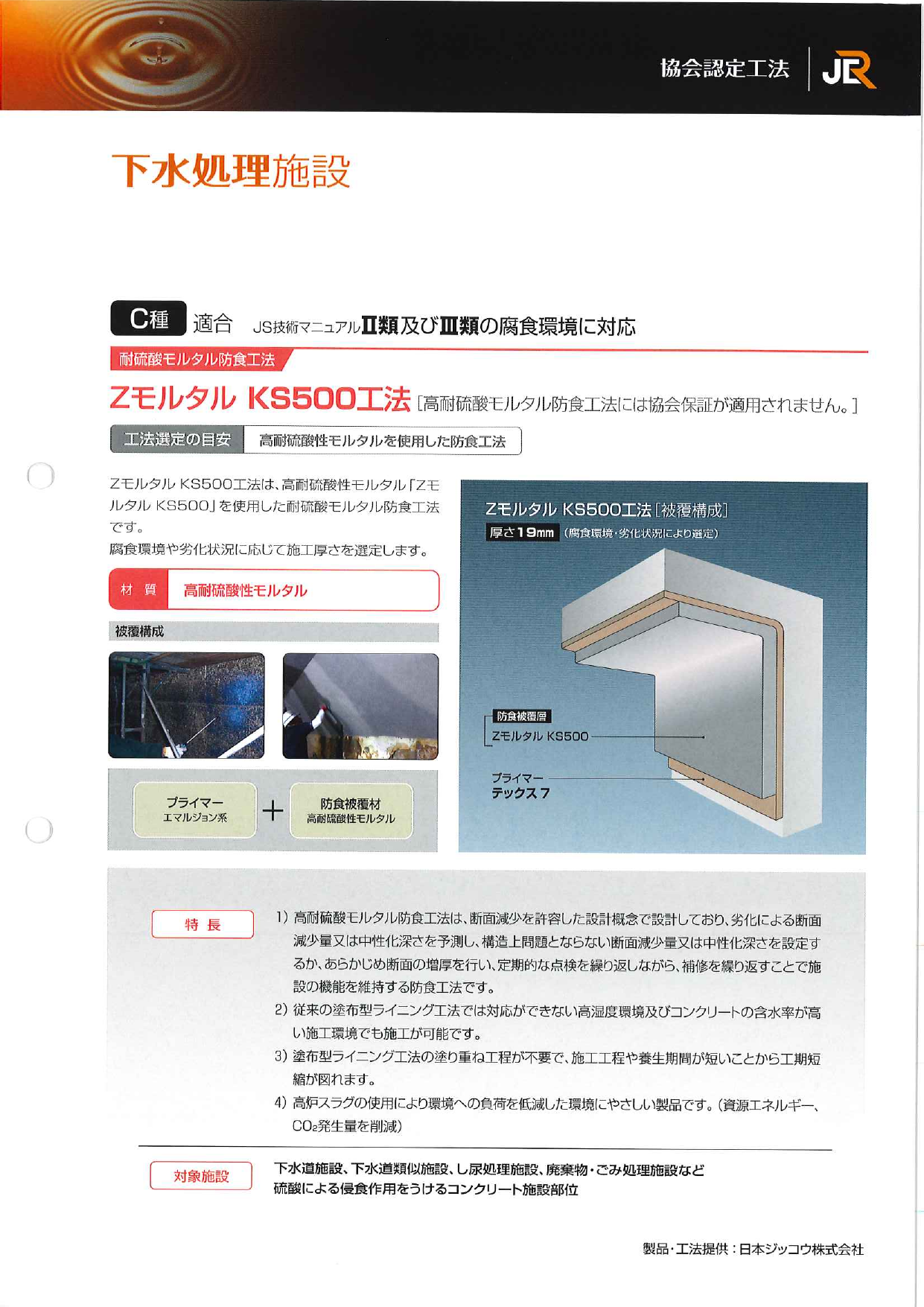 ZモルタルKS500工法は、高耐硫酸性モルタル 「ZモルタルKS500」を使用した耐硫酸モルタル防食工法です。 腐食環境や劣化状況に応じて施工厚さを選定します。 ◆詳細はカタログをダウンロードしてご覧ください。