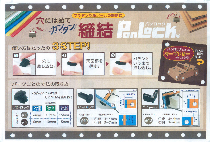 ・使い方はたったの3STEP! 1.穴に差し込む。 2.天面部を押す。 3.パチンというまで押し込む。 ・穴があいていればどこでも締結可能! ・締結できる素材の種類が豊富! ◆詳細はカタログをダウンロードしてご覧下さい。
