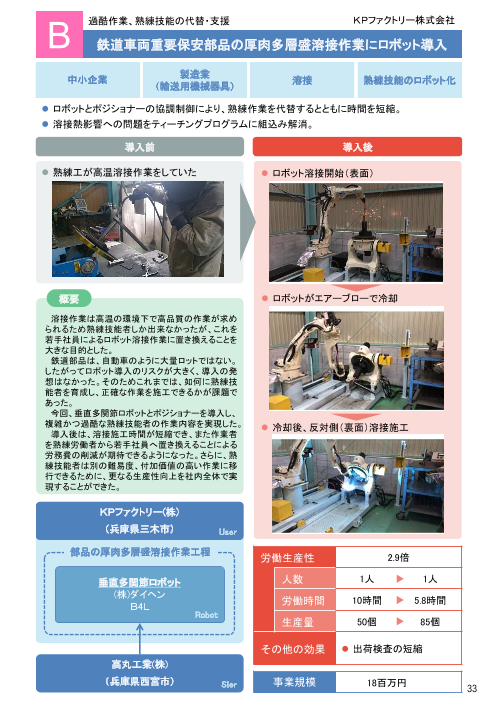 <導入前> 溶接作業は高温環境下で高品質の作業が求められるため、熟練技能者に依存していました。 <導入後> 垂直多関節ロボットとポジショナーを導入し、複雑で過酷な熟練技能者の作業内容を実現。溶接施工時間の短縮を実現したほか、作業者を熟練技能者か...