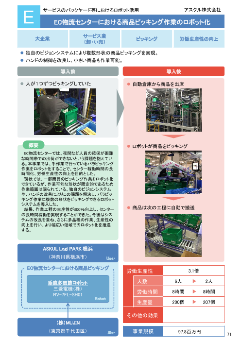 <導入前> 夜間など人員の確保が困難な時間帯で「出荷ができない」という課題を抱えていました。 <導入後> 手作業でおこなっていたバラピッキング作業をロボット化することで、センター稼働時間の長時間化、労働生産性の向上を実現しました。 ※詳細...