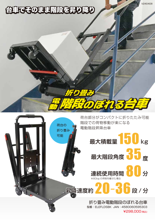 階段での荷物運搬が楽に行える電動階段のぼれる台車。 荷台部分が折りたためるので、使わない時はコンパクトに片付けることが可能です。 最大150kgまでの荷物を搭載可能。 3段階のスピード調整、4段階のハンドルの長さ調整ができます。