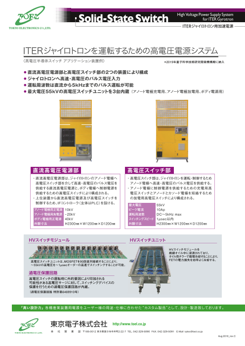 ・直流高電圧電源部と高電圧スイッチ部の2つの装置により構成 ・ジャイロトロンへ高速・高電圧のパルス電圧入力 ・運転周波数は直流から5kHzまでのパルス運転が可能 ・最大電圧55kVの高電圧スイッチユニットを3台内蔵 (アノード電極充電用、アノー...