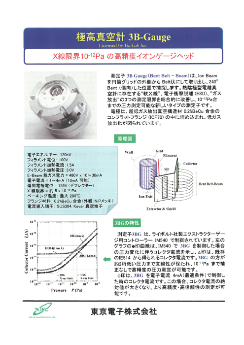 3B Gauge(Bent Belt-Beam)は、熱陰極型電離真空計に存在する「軟X線」「電子衝撃脱離(ESD)」「ガス放出」の3つの測定限界を総合的に改善し、10-11Pa台までの圧力計測が可能な新しいタイプの測定子です。