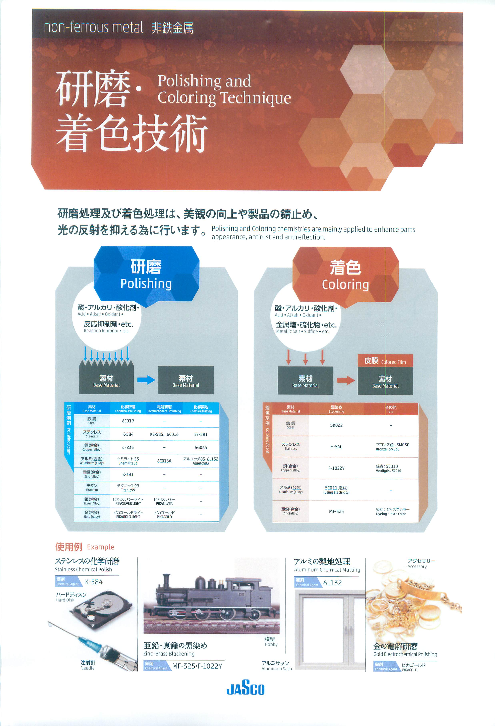 研磨処理及び着色処理は、美観の向上や製品の錆止め、光の反射を抑えるため位行います。 はく離剤は、めっきやイオンプレーティング膜、塗膜等の除去に使用し、製品や治具等の再生の際に用いられます。 ◆詳細はカタログをダウンロードしてご覧下さい。