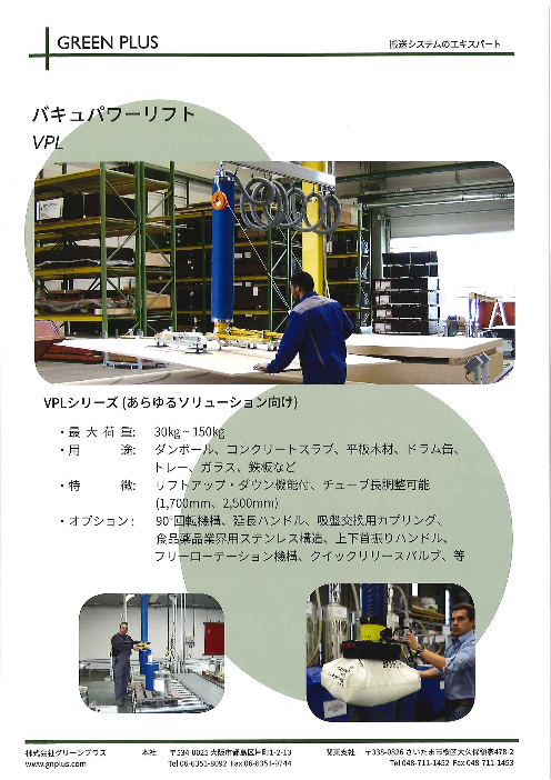 【特徴】 最大荷重:30kg~150kg 用途:ダンボール、コンクリートスラブ、平板木材、ドラム缶、トレー、ガラス、鉄板など 特長:リストアップ・ダウン機能付、チューブ長調整可能(1,700mm、2,500mm) オプション:90°回転機構、延長...