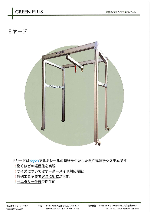 Eヤードはeeposアルミレールの特徴を生かした自立式運搬システムです。 【特徴】 ・驚くほどの軽量化を実現 ・サイズについてはオーダーメイド対応可能 ・特殊工具不要で容易に組立が可能 ・サニタリー仕様で衛生的 ◇その他詳細はカタログをダ...
