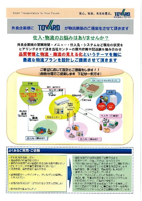 外食企業様の営業時間・メニュー・仕入先・システムなど現在の状況を ヒアリングさせて頂き当社センターの庫内作業や配送網を組み合わせ 品質管理と物流・商流の見える化というテーマを軸に 最適な物流プランを設計しご提案させて頂きます ◆詳細はカタログ...