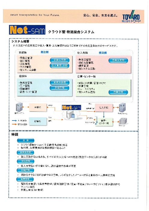 トワードは、物流・ロジスティクスを基盤とした幅広いサービスで お客様の声に応え続けてゆきます。 ・輪配送サービス ・物流センターシステム ・物流管理サービス ・トータル物流ソリューション ・環境保護への取組み ・GPSエコソリューション ...