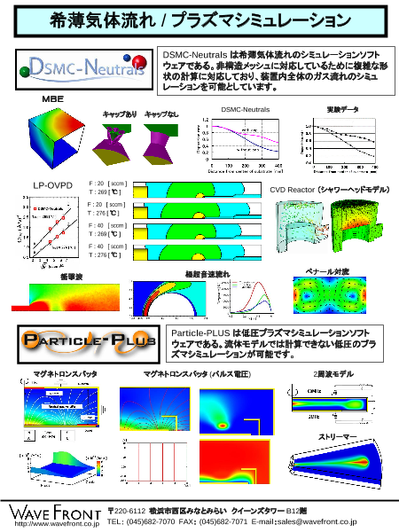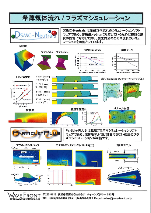 ■DSMC-Neutralsは希薄気体流れのシミュレーションソフトウェアです。 非構造メッシュに対応しているために複雑な形状の計算に対応しており、装置内全体のガス流れのシミュレーションを可能としています。 ■Particle-PLUSは低圧プラズ...