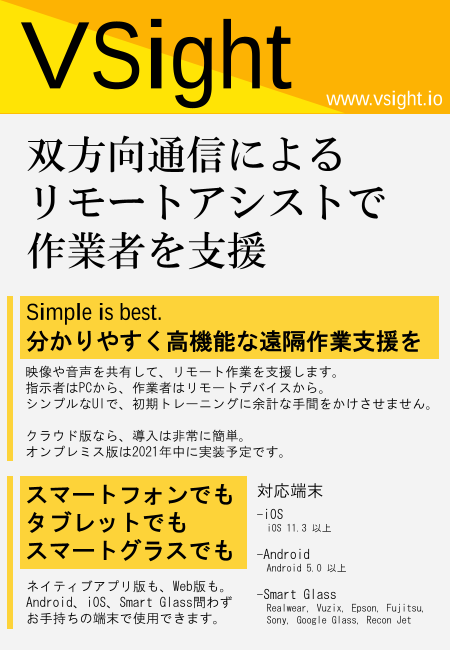 VSightは現場と事務所、現場と専門家をつなぎ、現場の課題解決に役立つ遠隔支援に特化したツールです。 VSightは、遠隔地にいる専門家や技術者がARをはじめとする様々な支援機能で作業支援が行えるツールです。 専門家が現場に直接出向くことなく各作業...