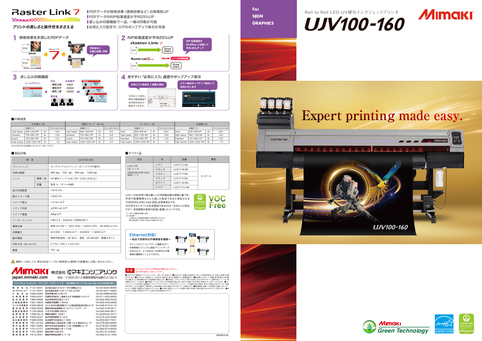 「UJV100-160」は新開発ヘッドを2基搭載し、高画質かつ高い生産性、安定稼働を追求したUV硬化インクジェットプリンタです。 安定した高画質プリントを可能とするNCU(Nozzle Check Unit)、NRS(Nozzle Recovery...