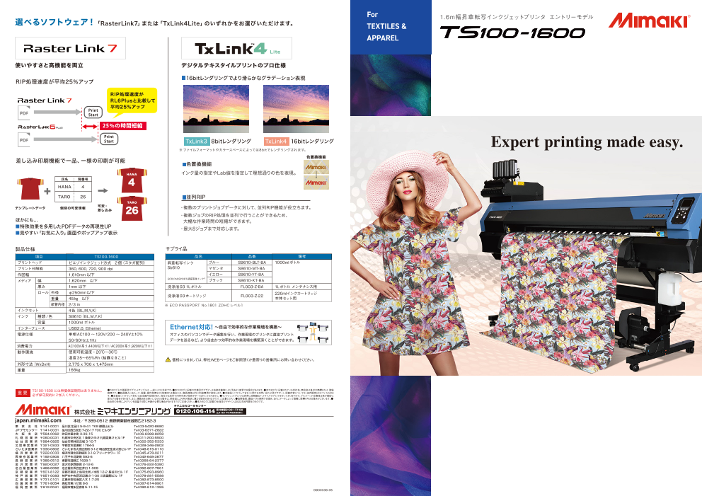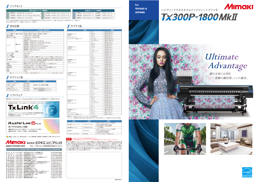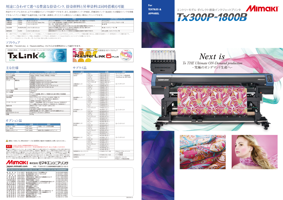 テキスタイルプリントの豊かなカラーグラデーションや技巧をこらした繊細なラインを見事に再現するMimakiのTx300P-1800。Tx300P-1800 MkIIではその機能をさらに進化させ、もう1つの特長である"ハイブリッドインク機能”に待望の紙へのプ...