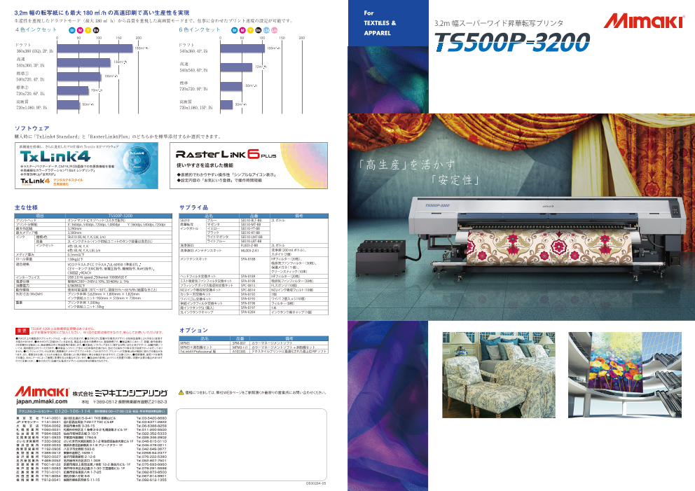 最大3.2m幅の昇華転写紙へプリントが可能な『TS500P-3200』は、カーテン、ソファー、ベッドカバーといった広幅の生地が必要なインテリア・テキスタイル市場や、急速に普及している屋内ソフトサインでお使いいただける、美しいプリントと「高生産」を活かす「...