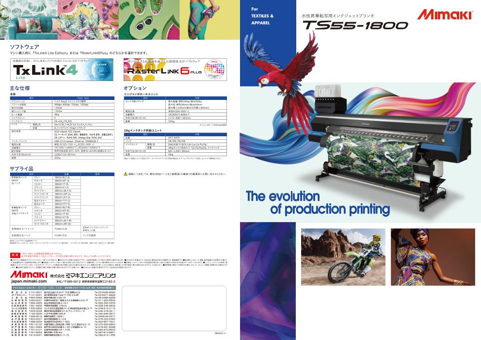 『TS55-1800』は、最速印刷速度135㎡/hの高生産性、優れた機能と便利なオプションによる長時間稼働の安定性、さらに生産コストの低ランニング化のすべてを実現した画期的なテキスタイル・アパレル向け昇華転写インクジェットプリンタです。