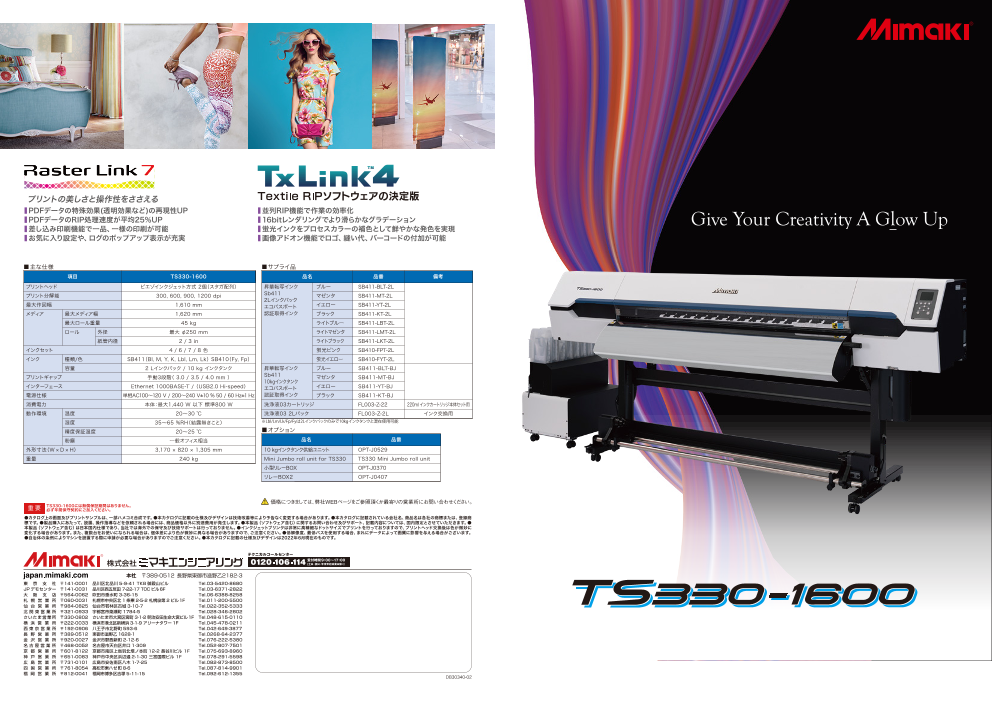 「330 Series」は、ミマキエンジニアリングが20年以上にわたり蓄積してきた技術力を結集し、美しい画質と高い生産性に加え、省作業をアシストする高い付加価値機能を備えたフラグシップモデルです。 「TS330-1600」は、Draftモード 69...