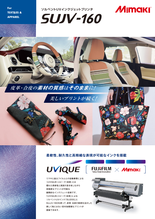 「SUJV-160」は、皮革・合皮へのプリントに特化したソルベントUVインクジェットプリンタです。 従来技術では難しかった皮革・合皮の基材そのものの質感を活かした印刷が可能で、バッグやシューズなどの小物からソファやフロアマットなどのインテリア、車や...