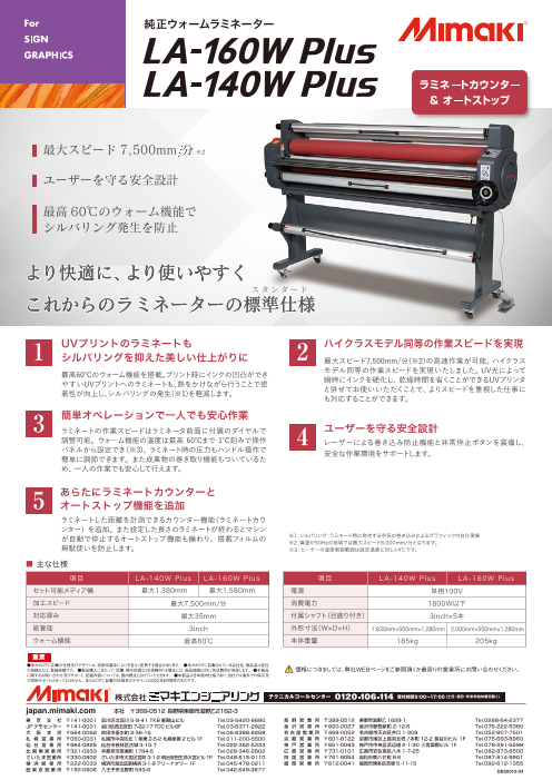 『LA-W Plus Series』は、最大スピード7,500mm/分(※1)の高速作業を実現し、UVプリントへのラミネートにも対応可能なウォームラミネーターです。 『LA-W Series』の後継機種で、高速作業性や簡単オペレーションといった特長...
