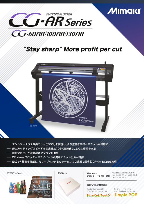 「CG-ARシリーズ」は、お求めやすい価格でありながら、より進化したカット性能と幅広いカット素材への対応力を併せ持ち、ユーザビリティを高めたカッティングプロッタのエントリーモデルです。 切り文字、ラベル、ステッカー製作はもちろんのこと、CG-ARで...