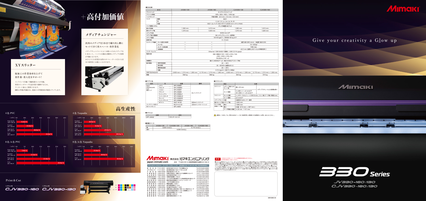 「330 Series」は、ミマキエンジニアリングが20年以上にわたり蓄積してきた技術力を結集し、美しい画質と高い生産性に加え、省作業をアシストする高い付加価値機能を備えたフラグシップモデルです。 「JV330 Series」は、エントリーモデル「...