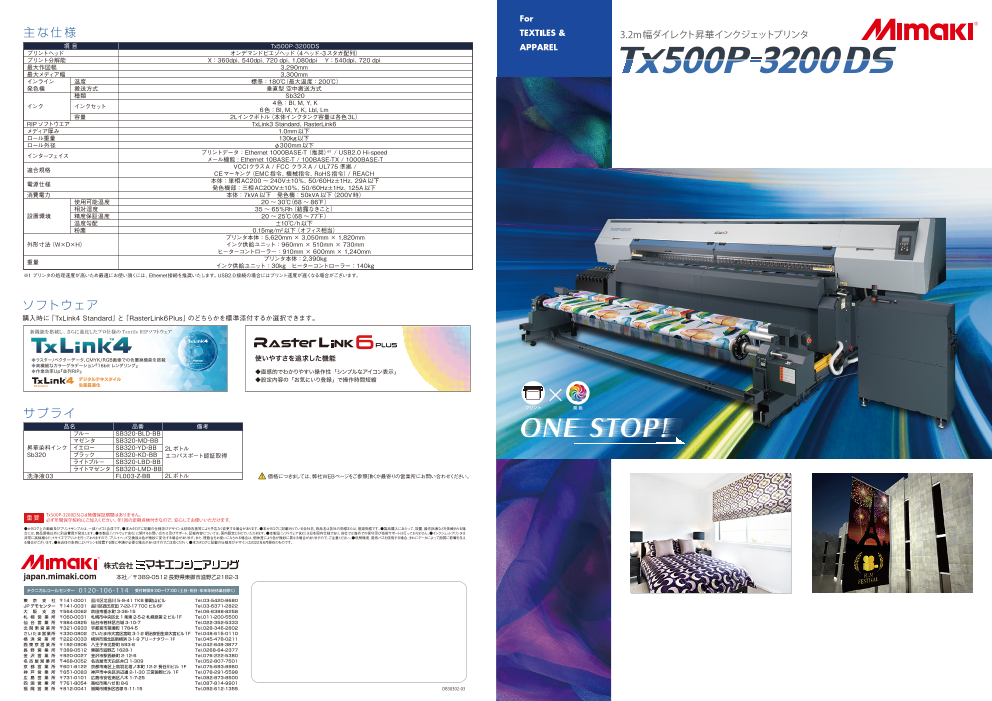 「Tx500P-3200DS」は、プリント後の発色に必要となる発色機をプリンタ本体に搭載することで、プリントから発色加工までの工程をワンストップで行うことができます。 最大3.2m幅のポリエステル生地へプリントが可能なため、急速に普及している大型ソ...