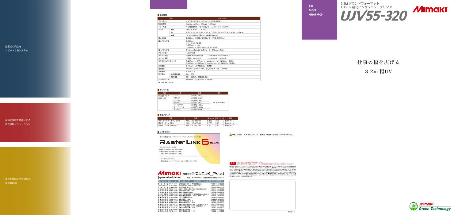 『UJV55-320』は高いコストパフォーマンスを実現し、あなたの「仕事の幅を広げる」3.2m幅LED-UV硬化インクジェットプリンタです。 高付加価値プリントを提供するホワイトインク ・透明メディアにホワイトインク、カラーインクを組み合わせるこ...