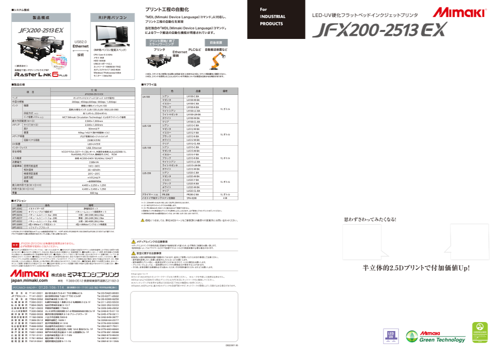 「JFX200-2513 EX」は「JFX200-2513」の後継機で、エントリーモデルでありながら高付加価値プリントと高生産性を兼ね備えた大判フラットベッドUVインクジェットプリンタです。 また、さらに安定性やユーザビリティも向上しました。