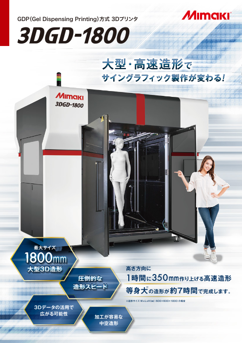 「3DGD-1800」は最大造形サイズが1,450 × 1,110 × 1,800 mm(W × D × H)の、立体看板や造形サイン製作に適した大型3Dプリンタです。 ジェル状の紫外線硬化樹脂を線状に押出し、紫外線により瞬時に硬化させて積層する「...