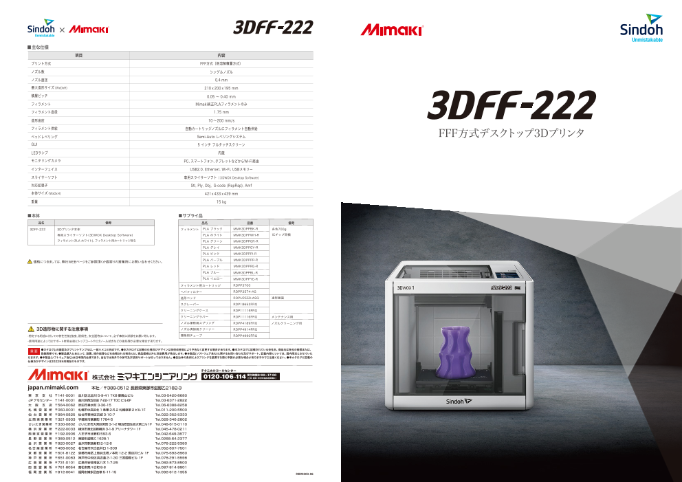 「3DFF-222」(※1)はFFF(熱溶解積層)方式(※2)で、最大造形サイズが210mm × 200mm × 195mm(W × D × H)のデスクトップ3Dプリンタです。 当社フラットベッドUVプリンタとの組み合わせに最適で、プリント治具制...