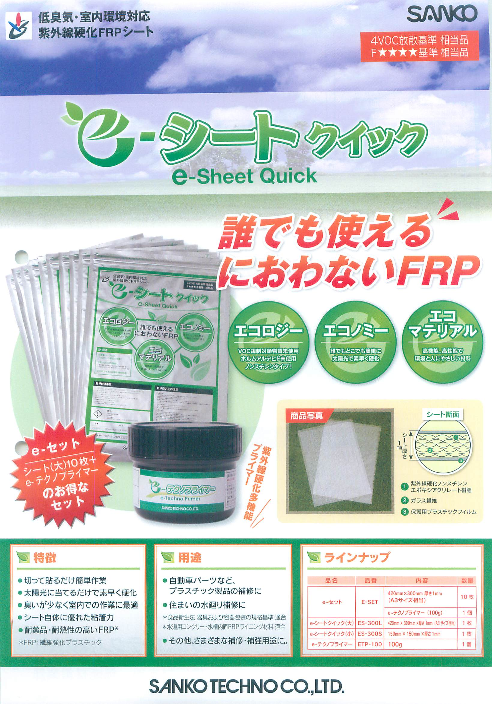 特徴 ・切って貼るだけ簡単作業 ・太陽光に当てるだけで素早く硬化 ・臭いが少なく室内での作業に最適 ・シート自体に優れた粘着力 ・耐薬品・耐熱性の高いFRP(繊維強化プラスチック) ◆詳細は、カタログをダウンロードしてご覧ください。