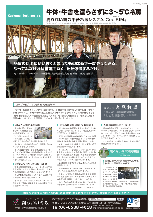 CoolBIM(R)とは、熱暑ストレスによる乳量低下を予防するため、牛舎内温度を5℃以上低下させる冷房装置です。 非常に微細な”セミドライフォグ(R)”の気化熱を利用し、牛体や牛床を濡らすことなく、効率よく牛舎を冷房できます。 ◆詳細は、カタログ...